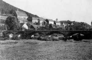 wurde 1899 eingeweiht. Im Jahr 1914 wurde sie vor dem Aufstauen gesprengt. Die beiden Bögen am Ufer sowie die beiden Stützen in Flußmitte sollen noch erhalten sein.